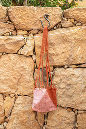 La técnica que utilizo para la elaboración de las mochila guane se llama “entrelazado recíproco” o "sprang”. Implica que el juego de hilos utilizados está amarrado en ambos extremos del telar o urdimbre, de manera que, al entrelazar los hilos en un extremo (pita o piola en algodón) se vaya formando tejido o paño, el proceso se repite en imagen de espejo al otro extremo.